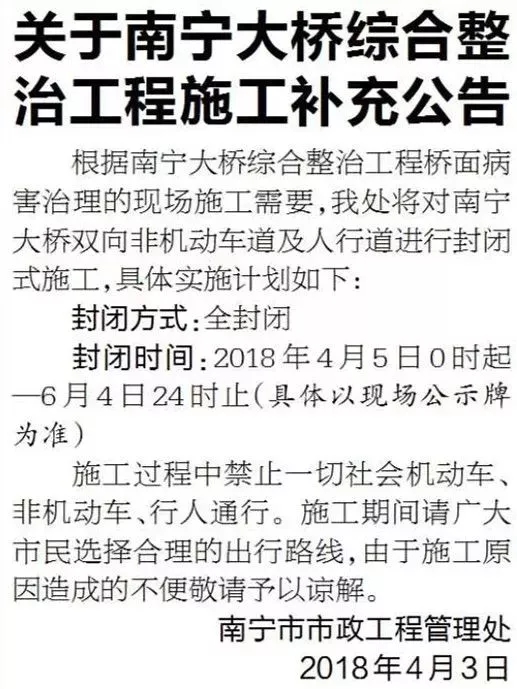 從4月份開始全封閉綜合整治施工的南寧大橋原定于6月4日24時恢復通車,為了保障高考、方便兩岸市民出行,參建各方正在加班加點工作,計劃于5月31日晚10點通車,比原定時間提前5天。