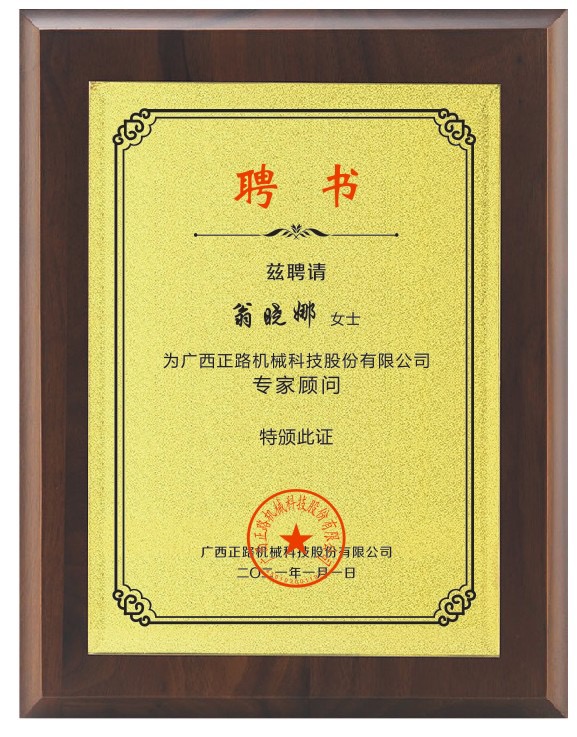 為了更進一步制定好公司發(fā)展戰(zhàn)略,全方位提升公司的整體實力,推動公司業(yè)務(wù)轉(zhuǎn)型升級發(fā)展,2021年1月1日,廣西正路機械科技股份有限公司正式聘請:中國SBS改性瀝青發(fā)展元年原路安特技術(shù)總監(jiān)翁曉娜女士為公司專家顧問,為公司戰(zhàn)略轉(zhuǎn)型升級提供發(fā)展基礎(chǔ)和堅實的后盾。授牌儀式于2021年6月18日在南寧青秀區(qū)公司總部正式舉行,公司領(lǐng)導(dǎo)歸立發(fā)、陸麗燕等參加授牌儀式。