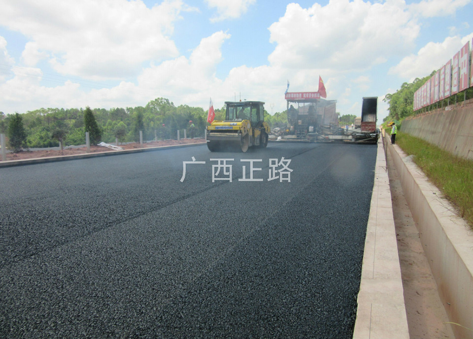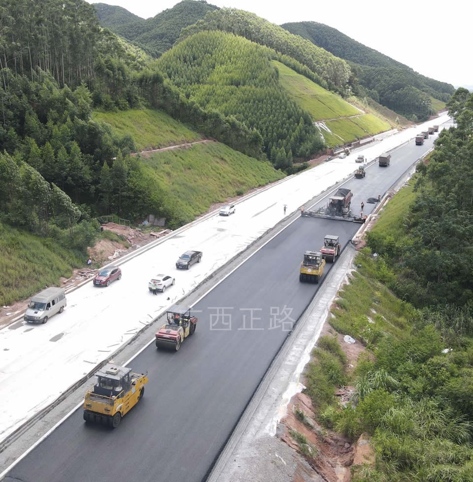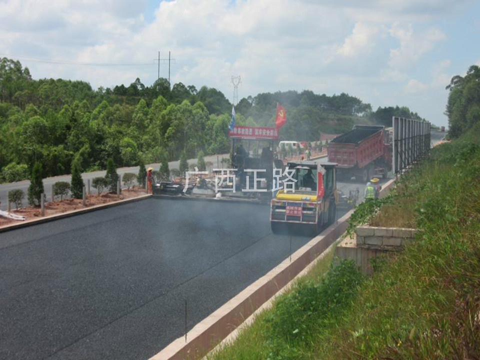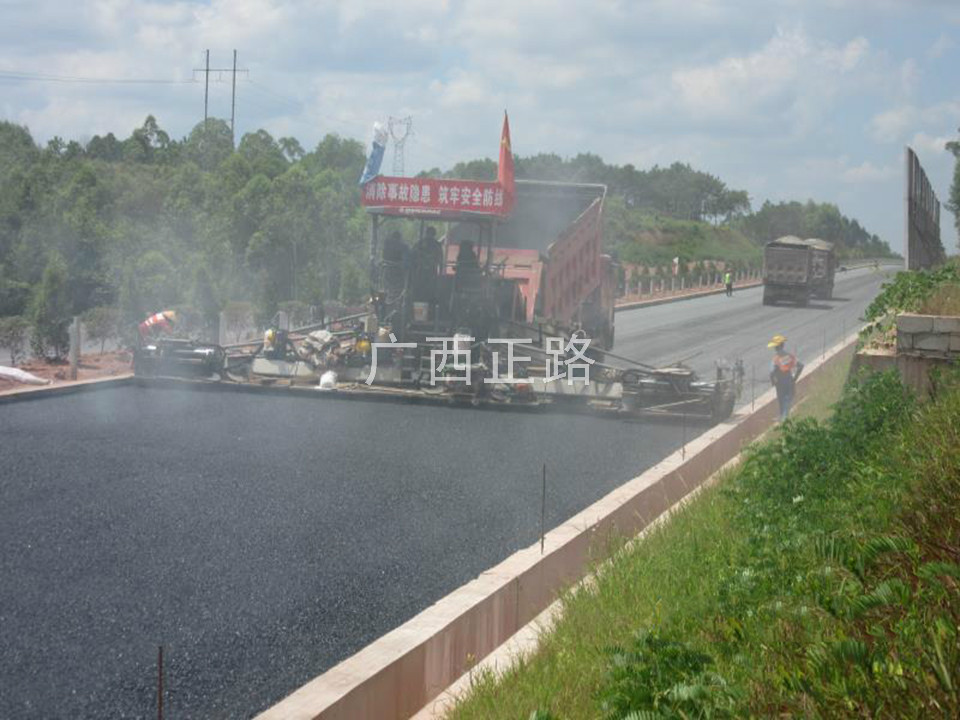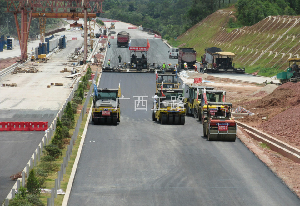 荔玉高速是按雙向四車道高速公路標(biāo)準(zhǔn)建設(shè),設(shè)計速度為 120Km/h,路基寬度為27m。荔玉高速主要亮點是:設(shè)計采用了 26cm 厚底基層和 30cm 厚基層作為路面的主要承重結(jié)構(gòu)層,并要求采用大寬度、全斷面和大厚度一次成型攤鋪碾壓技術(shù)。為此,我公司引進了徐工最新大寬度大厚度全斷面攤鋪碾壓設(shè)備:徐工 RP1855 攤鋪機和徐工XS365 大噸位壓路機,使得荔玉高速實現(xiàn)了 26cm 厚底基層和 30cm厚基層大寬度大厚度一次性攤鋪壓實成為了可能,施工質(zhì)量遠遠領(lǐng)先于常規(guī)施工厚度下的水穩(wěn)結(jié)構(gòu)層。同時,我公司為了保證瀝青面層的施工質(zhì)量,采用了大功率并自帶端伸縮裝置的戴納派克 SD2550CS瀝青攤鋪機,最大攤鋪寬度達到 14 米,端伸縮可變寬度達 2 米,有效解決了荔玉高速填挖方段寬度不一致的過渡順接問題,實現(xiàn)了瀝青面層全斷面一次性攤鋪的目標(biāo)要求,得到了項目、總監(jiān)辦和業(yè)主方的一致認(rèn)可和好評!