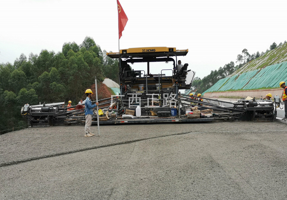 桂平東互通加寬段采用兩臺帶端伸縮裝置攤鋪機并機梯隊施工